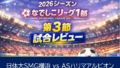 昨季王者の名古屋にとっては2分1敗と苦しい立ち上がりとなり、愛媛にとってはスタイルの明確さと実行力が実を結んだ今季初勝利になった。第3節全体を振り返るうえで、この試合は「対策されたビルドアップ」と「強度ある前線守備」の関係を象徴する一戦だったといえる。詳しくは、名古屋 vs 愛媛の詳細レビューをご覧いただきたい。