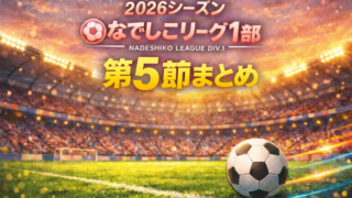 節別まとめ 【第5節まとめ】静岡SSUボニータが首位堅持、伊賀FCくノ一三重は劇的初勝利 オルカ鴨川FCは痛恨ドロー|2026プレナスなでしこリーグ1部 2026プレナスなでしこリーグ1部第5節を総括。静岡SSUボニータが愛媛FCレディースに4-0で快勝して首位を堅持。伊賀FCくノ一三重の劇的な今季初勝利、オルカ鴨川FCの終盤失点ドロー、日体大SMG横浜の4-1勝利、名古屋と宮崎の引き分けなど全6試合を振り返ります。 2026.04.19 節別まとめ